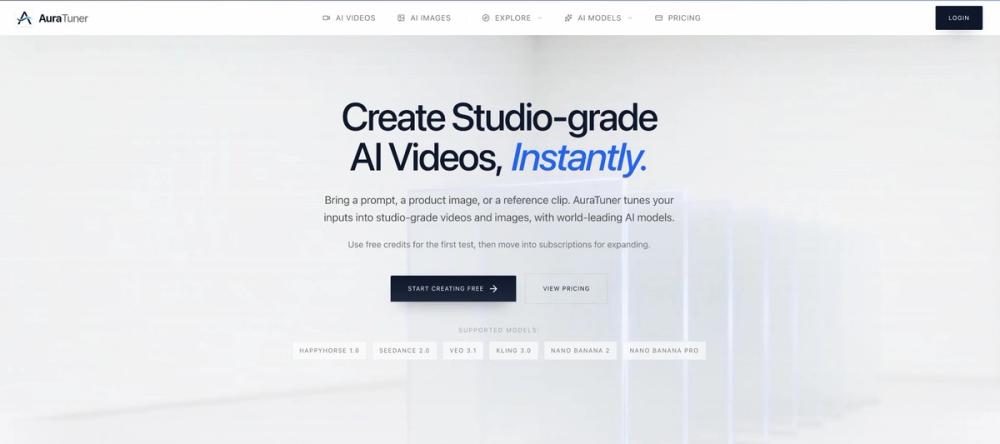 AuraTuner is a comprehensive AI-powered platform designed for effortlessly creating studio-grade videos and images. It streamlines the creative process by allowing users to transform prompts, product images, or reference clips into high-quality visual content using world-leading AI models. The platform offers a clear workflow, guiding users directly to either the Video Studio or Image Studio based on their project needs, ensuring that model selection is integrated seamlessly into the creative flow.